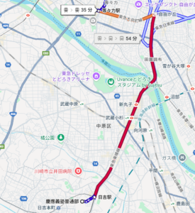 都市大等々力は東急大井町線等々力駅から徒歩12分の距離にある。15時に普通部の門を出た場合の公共交通機関は以下のようになる。