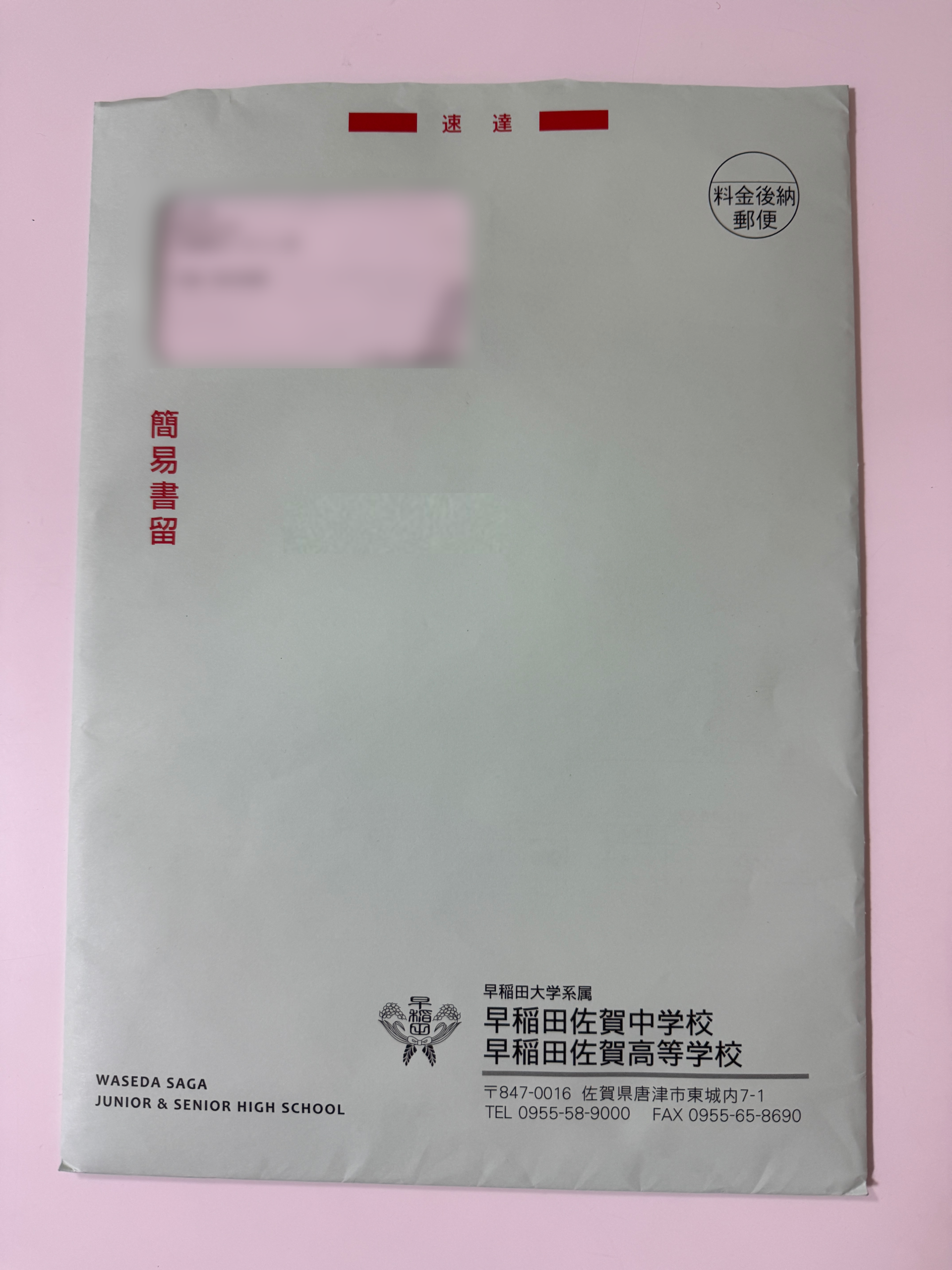 1/17の合格発表の翌日、午前中に早稲田佐賀から速達が届いた。手続き書類などが入ってることだろう。