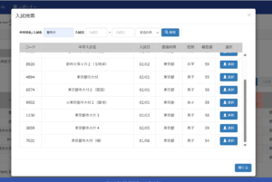 すると、事前に登録していた志望校の判定と順位が出てきます。右上の「入試検索」ボタンを押すと、実は登録してない志望校も判定できるのです。