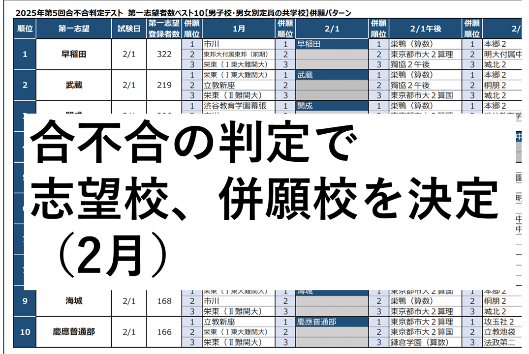 5日の候補は非常に厳しい状況にあるか、あるいは他校の合格を勝ち取っていて、さらなる上位を目指すかどちらかになります。2日午前にターゲットとしてあった攻玉社はその日では回避しましたが、ここにきて5日受験で視野に入ってきます。